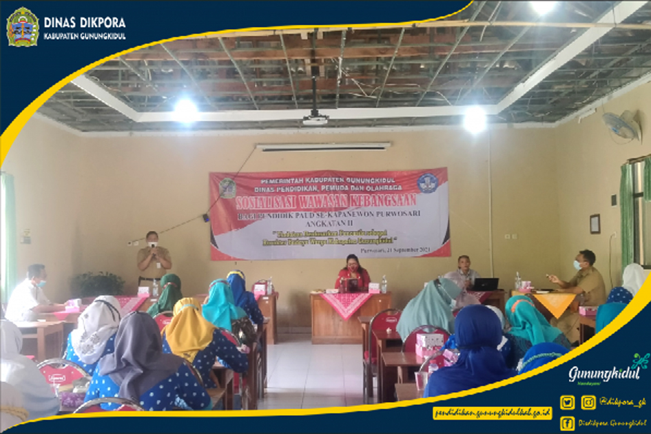 PURWOSARI- Dinas Pendidikan, Pemuda, dan Olahraga (Disdikpora) Kabupaten Gunungkidul menyelengarakan kegitan Sosialisasi Wawasan Kebangsaan Bagi Pendidik PAUD se- Kapanwon Purwosari